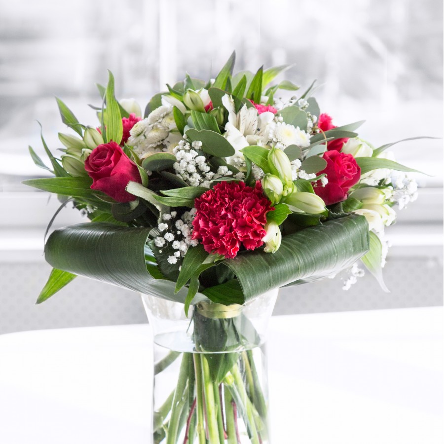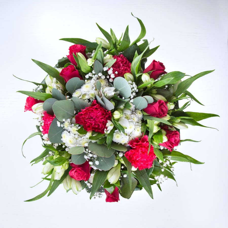 Celebrate with our beautiful and unique bouquet, featuring a captivating mix of white chrysanthemums, graceful gypsophila, striking red roses, and elegant carnations. Enhanced with white alstroemeria and lush aspidistra leaves, each arrangement is a masterpiece of color and design.